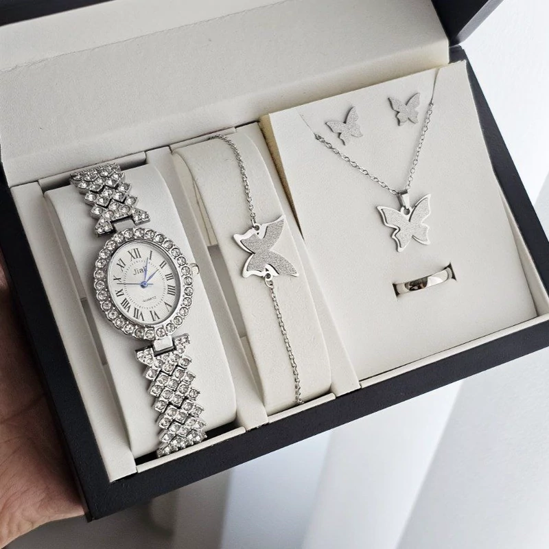 ساعت مچی دخترانه زنانه پروانه با ساعت نگین دار دستبند گردنبند گوشواره انگشتر استیل نقره ای
