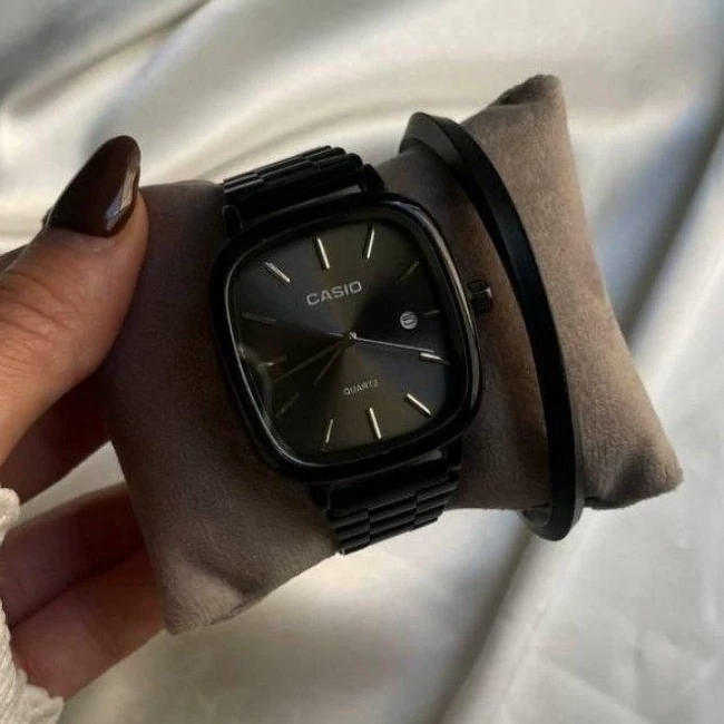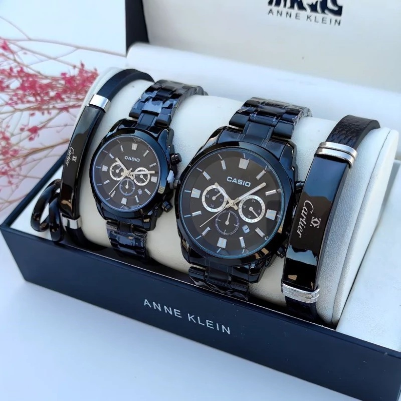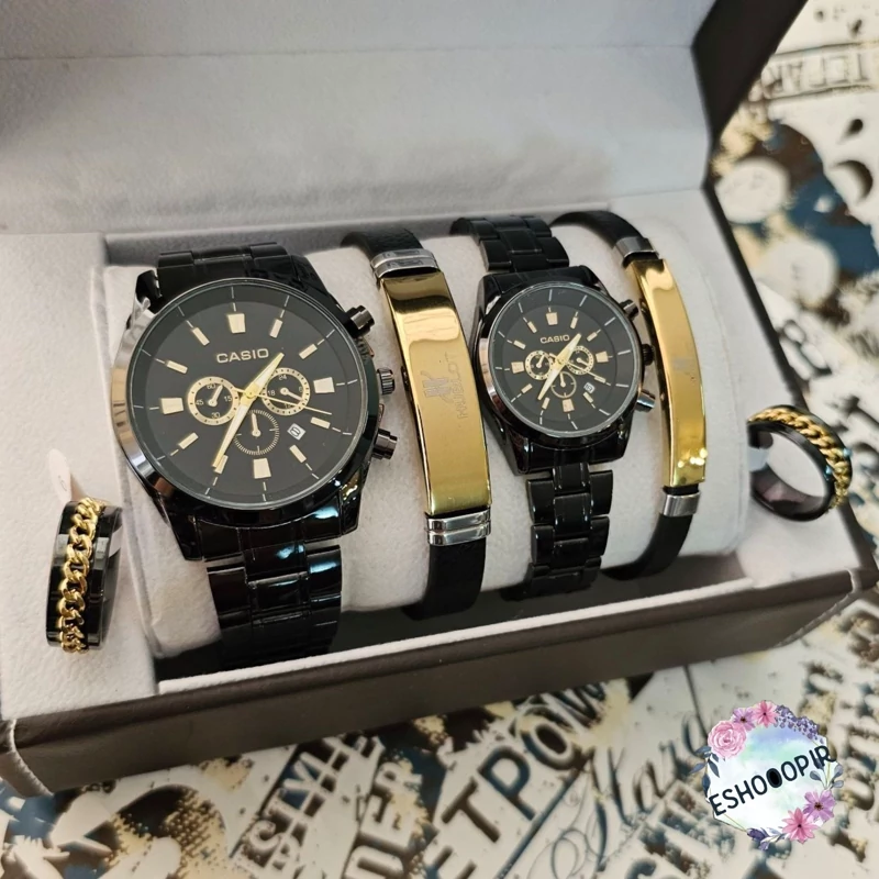 ست ساعت مردانه و زنانه مشکی برند کاسیو با دستبند و انگشتر و کیفیت عالی