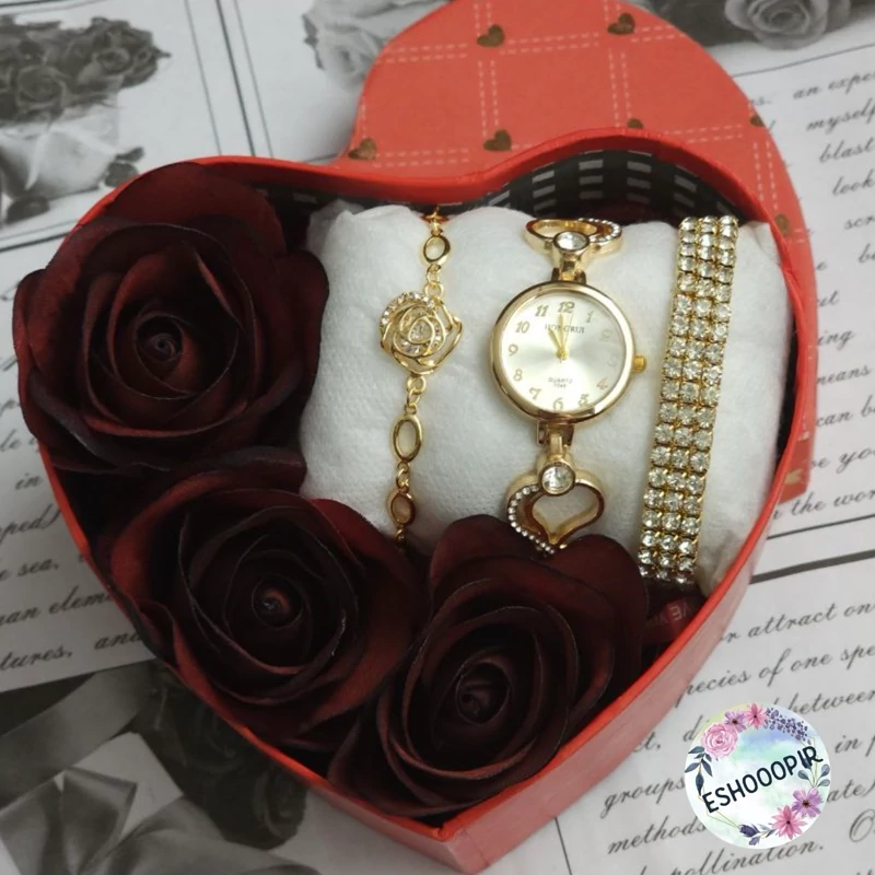 پک هدیه زنانه ساعت و دستبند با باکس و گل مناسب کادو به خانم ها