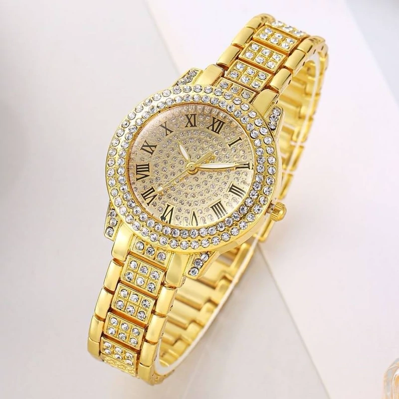 ساعت مچی زنانه فول نگین طلایی با بند و صفحه نگین دار